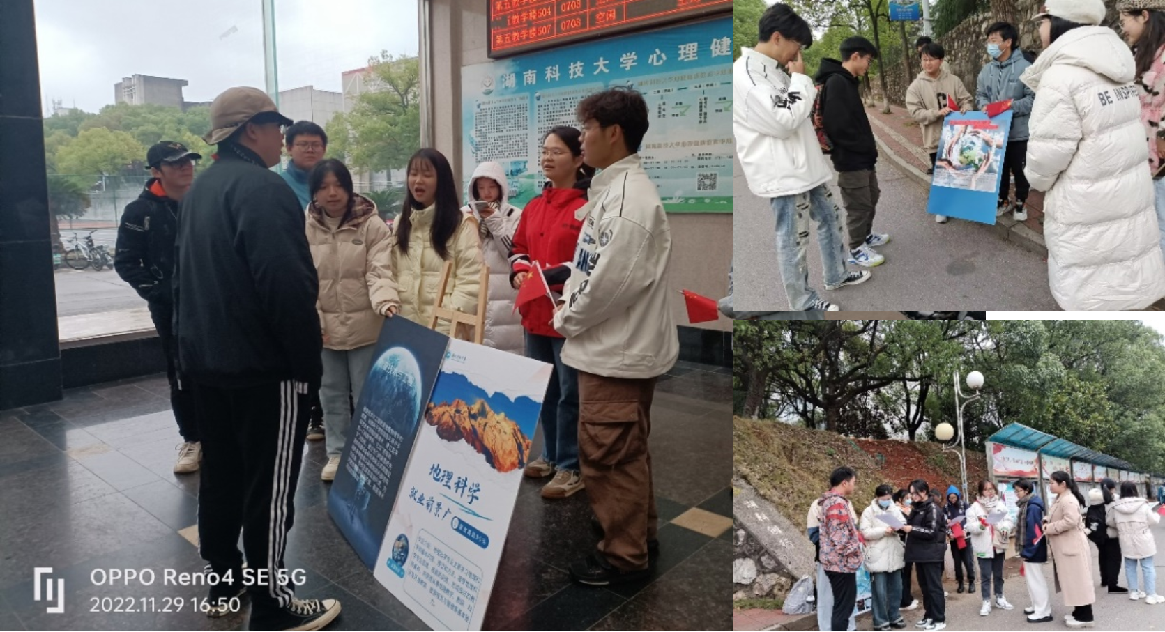 入党积极分子以小组为单位精心准备活动,废寝忘食地收集整理有关科普知识,绞尽脑汁地设计海报。他们分成五个小组在南北校摆点,向全校师生进行科普宣传。即使室外北风呼啸寒冷刺骨,也挡不住他们向过往师生科普的热情。他们积极地向大家介绍自己的专业特色、专业内容以及专业在实际生活中的应用。在宣传中,来自马克思主义学院的同学知道了“3s测绘”的基本内涵;来自土木学院的同学对“智慧城市建设中的地理信息”有了一定的了解。