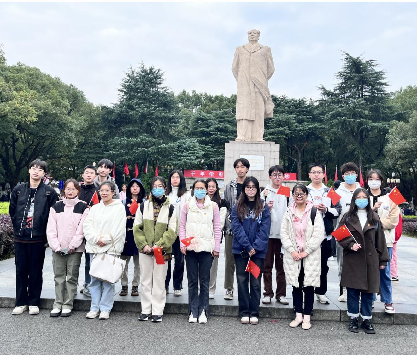 尽管已是初冬但仍然能感受到秋高气爽,预备党员们怀着赤诚的信念,高举红旗,在刘俊老师的带领下,迈出了坚定的步伐。到达岳麓山的东方红广场,大家怀着崇敬的心情与毛主席雕塑合影留念。