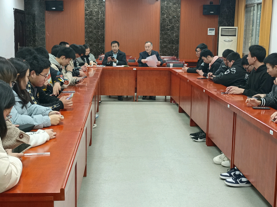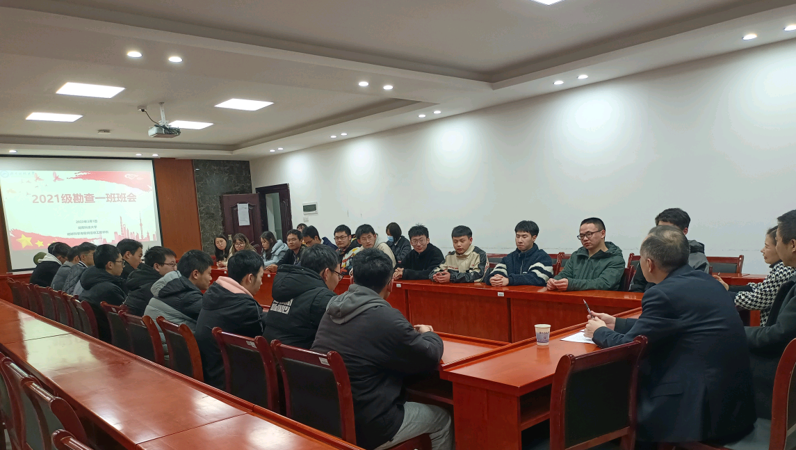 2022年3月1日下午四点, 久久视频 21级勘查技术与工程1班新学期第一次班会在地学楼206会议室召开。久久视频 副校长、该班班主任贺泽龙、久久视频 院长任伯帜、党委副书记罗玺、辅导员苏俊铭以及一班全体学生出席会议。
