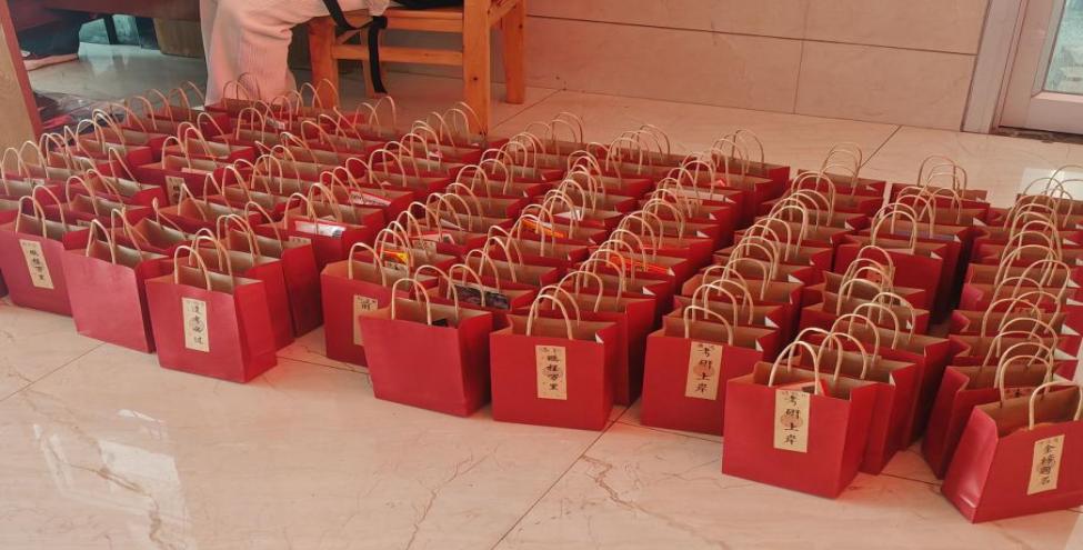 各位老师和同学们精心为备战考研的学子们准备好了相应的礼包,并一一做好标记,贴上不同的祝福标签“鹏程万里”“逢考必过”“前程似锦”等。保证每一位学子都收到的是独一无二的一份礼包,也表明了学院对每一位考研学子独有的关心。礼包使用红色的手提袋,寓意着“红红火火”;礼包包含了旺旺饼干、暖宝宝、甜橙、许愿瓶等小礼品,每一个都饱含着老师们的殷殷祝福:预祝每位学子都胜利在“旺”,心想事“橙”;一份暖宝宝表达了老师们温暖的陪伴与关心,一个许愿瓶体现着老师们坚信每一位学子都会所愿皆成,一战上岸。