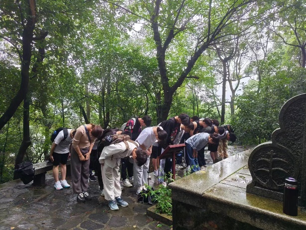 瞻仰完陈国达院士塑像后,同学们沿小路攀登岳麓山,在山脚的丁文江先生墓碑前,石得凤老师向同学们介绍了丁文江先生在中国地质事业中的重要地位和杰出贡献,让学生们深入学习我国第一代地质工作者忧国忧民、甘于奉献的精神。随后,石老师带领同学们给丁文江先生墓碑鞠躬,并在墓碑前师生同唱《勘探队员之歌》,表达了新时代地质人传承前辈奉献精神、投身地质事业的决心和热情。