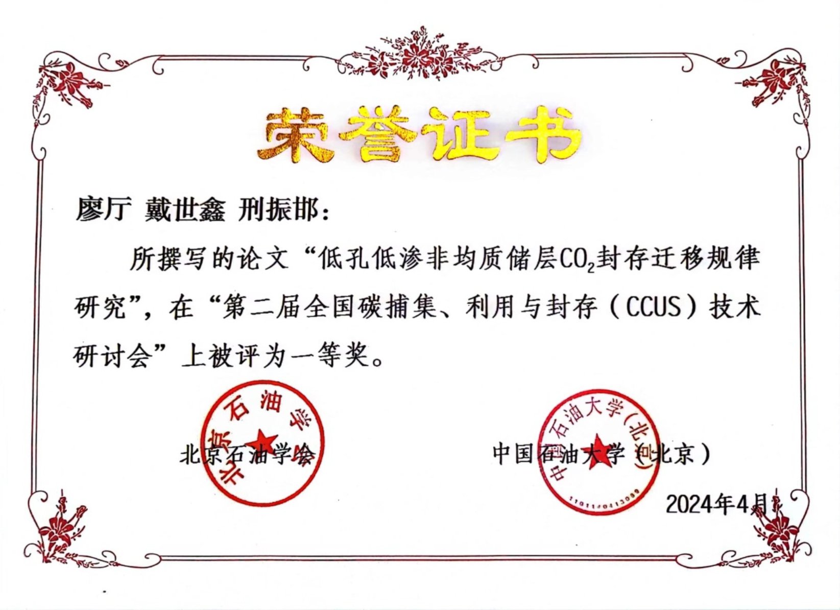 CCUS技术是实现大规模碳减排的关键技术之一,为交流二氧化碳捕集、利用、封存、监测和安全等方面的技术和装备研究,加强CCUS关键核心技术攻关,加快CCUS产业链发展,北京石油学会、中国地质学会石油地质专业委员会、中国石油大学(北京)、中国矿业大学、吉林省石油学会、河北省石油学会、上海市石油学会、辽宁省石油石化学会、中国石油天然气集团有限公司三次采油重点实验室、中国石化碳捕集、利用与封存(CCUS)重点实验室、陕西省二氧化碳封存与提高采收率重点实验室、山东大学、西南石油大学、中国石油大学(华东)、北京科技大学、东北石油大学等单位于2024年4月24日至26日联合召开了“第二届全国碳捕集、利用与封存(CCUS)技术研讨会”,戴世鑫副教授指导的硕士生廖厅论文《低孔低渗非均质储层CO2封存迁移规律研究》,获得大会一等奖。