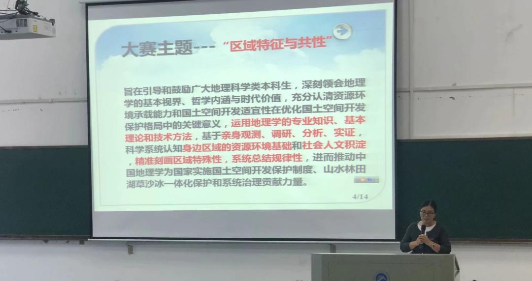 会议伊始,常晓丽老师向大家详细介绍了大赛情况:大赛旨在引导和鼓励广大地理科学类本科生,运用地理学的专业知识、基本理论和技术方法,科学系统认知身边区域的资源环境基础和社会人文积淀,精准刻画区域特殊性,系统总结规律性,进而推动中国地理学为国家实施国土空间开发保护制度、山水林田湖草沙冰一体化保护和系统治理贡献力量。