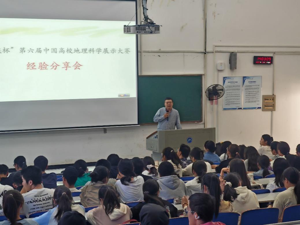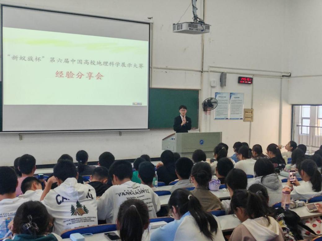 ”)于第一教学楼组织开展了中国高校地理科学展示大赛参赛经验分享会。出席本次会议的有地理系主任李振国老师、地科与地信专业其他教师,以及地理科学专业全体同学。
