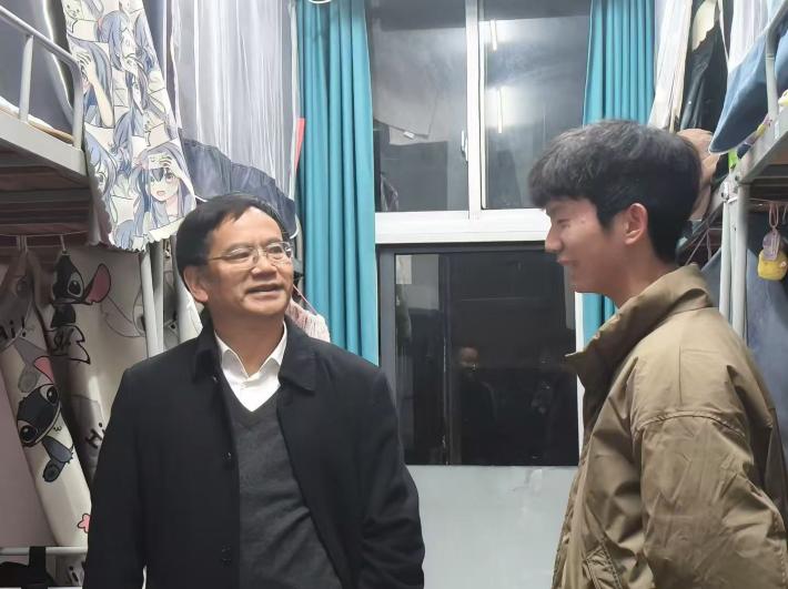 走访过程中,龙四春书记与同学们亲切交谈,逐一确认到校适应情况,并详细了解寒假期间同学们的学习实践活动,仔细询问同学们今后有关就业、深造等毕业规划的情况,鼓励同学们以饱满的热情投入新学期,正确把握时代发展趋势,合理规划学业目标,积极参与各种学科竞赛,夯实专业基础,积累就业优势。龙书记还提醒大家注意春季流感防护,做好健康管理,严格遵守用电规范,杜绝使用违规电器,共同营造安全舒适的宿舍环境。同学们纷纷表示在交流过程中倍感关怀和鼓舞。
