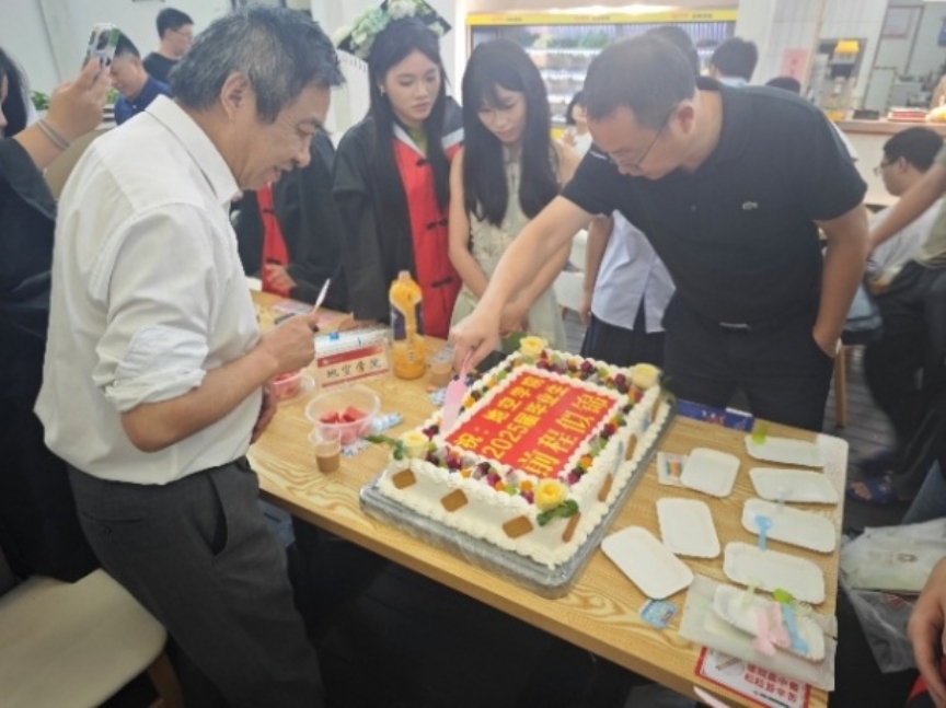 活动现场,学院党委书记龙四春与毕业生代表共同切开写有“前程似锦”的毕业蛋糕。师生们一同分享这份甜蜜,现场气氛温馨热烈,欢声笑语中满是对毕业生的祝福与期许。